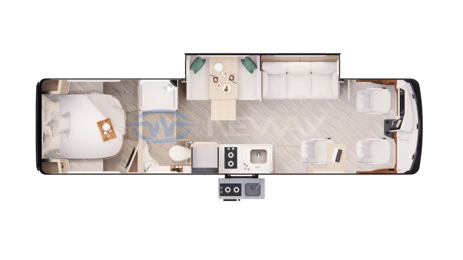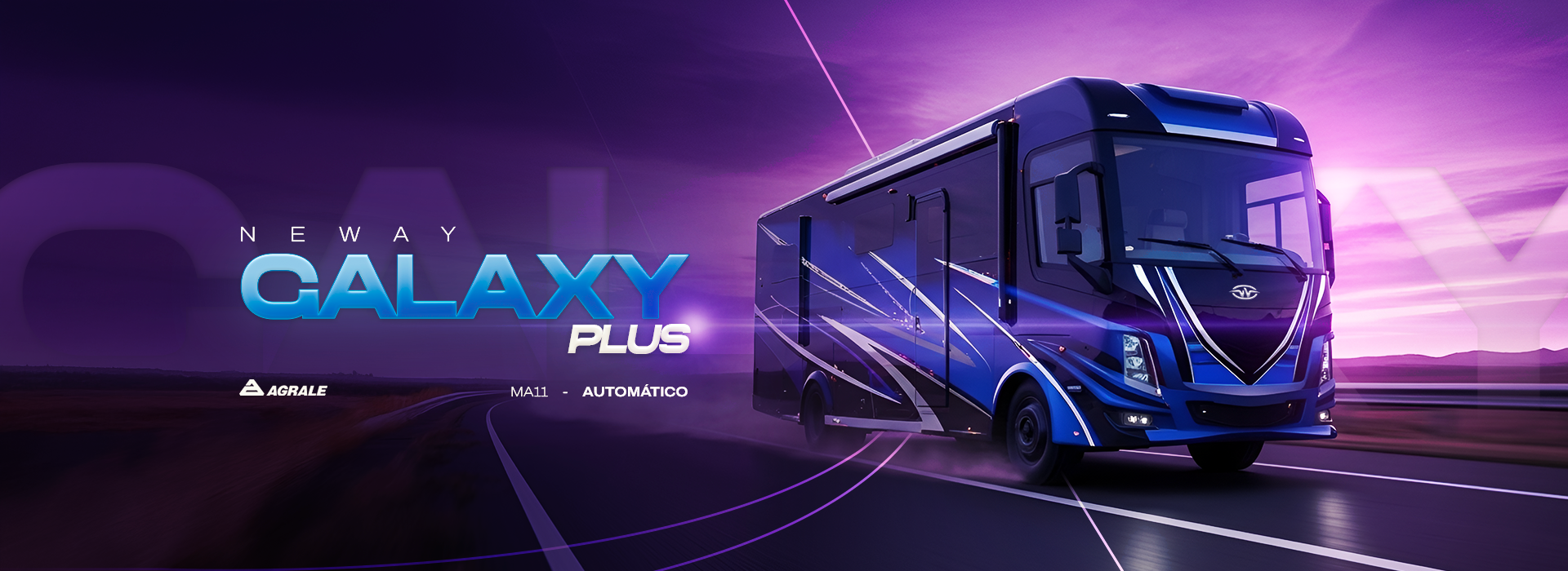 Montado com cabine exclusiva projetada pela Neway sobre a plataforma do chassi Agrale, específica para Motorhome (9,2m comprimento), o Neway GALAXY oferece opcional de câmbio automático e acomoda de 06 pessoas confortavelmente.